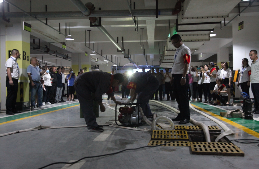 本次防洪防汛演練主要分為險(xiǎn)情報(bào)警、疏散地下室車輛、對(duì)地下室出入口阻擋、工程組對(duì)地下室積水進(jìn)行排除、醫(yī)療救護(hù)組對(duì)受傷人員進(jìn)行醫(yī)療救助、搶險(xiǎn)組搶救地下室漫水車輛、消殺組對(duì)地下室過水區(qū)域整體消殺,七個(gè)演練科目。演練過程中各個(gè)小組處置險(xiǎn)情反應(yīng)迅速、配合默契、處置有力,且全體參演人員態(tài)度端正,嚴(yán)肅認(rèn)真,最大限度降低危急情況造成的危害。