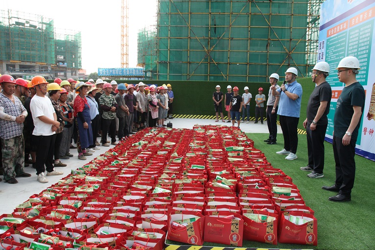 集團(tuán)領(lǐng)導(dǎo)為一線工人送上降暑飲品和防暑藥品并且親切握手慰問。集團(tuán)總裁謝澤波對在場的工人表示誠摯的感謝和衷心的慰問,感謝他們在烈日下的辛勤付出,大家戰(zhàn)烈日斗酷暑的奮斗精神令人敬佩,美麗家鄉(xiāng)的建設(shè)離不開每一位堅(jiān)守崗位的工友。天氣炎熱要注意防暑降溫,保障身體情況,合理安排施工時(shí)間,及時(shí)補(bǔ)充水分注意休息。